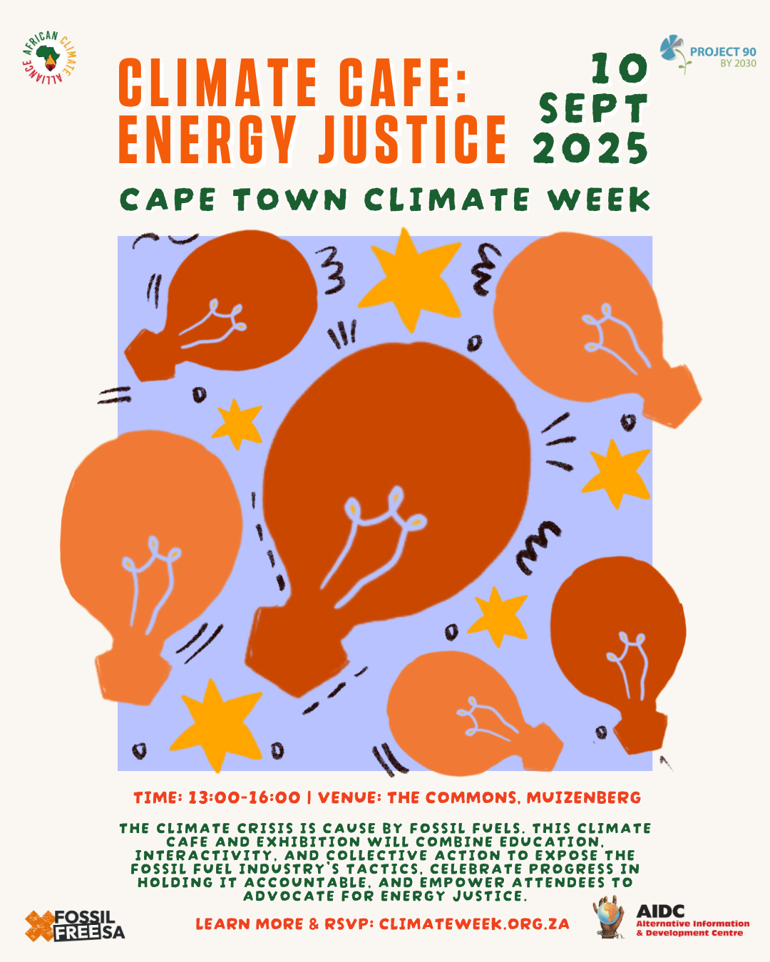 By exploring the 6 thematic areas, Cape Town Climate Week 2025 aimed to promote dialogue, collaboration and, fun, and dynamic action towards building a sustainable and just future in South Africa. This will be done through group cycles, teach-ins, tours, screenings, and gatherings across the city.