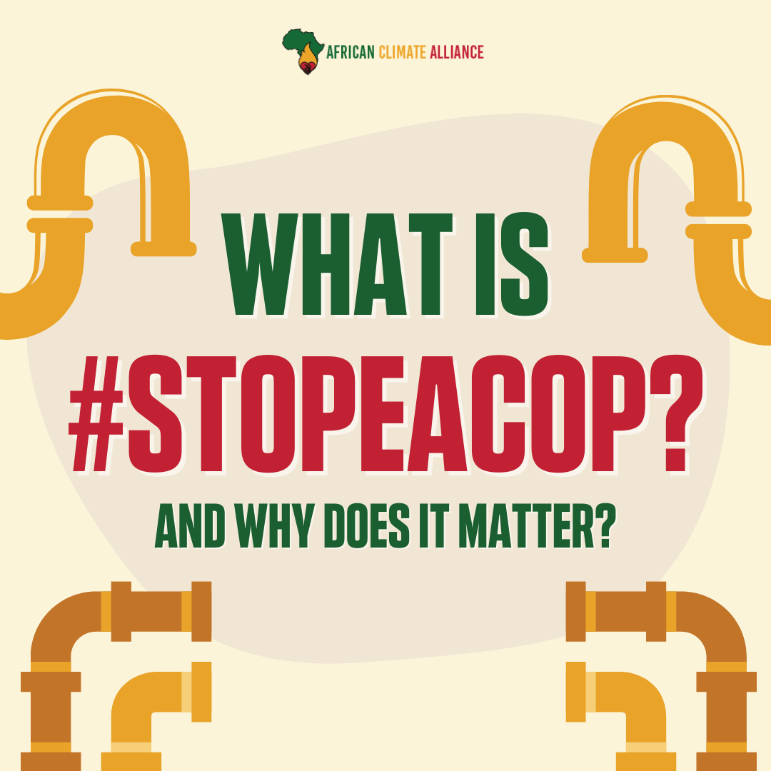 EACOP stands for East African Crude Oil Pipeline, which is a proposed 1,445-kilometer heated pipeline that will transport oil from Hoima, Uganda to the port of Tanga in Tanzania. The #STOPEacop campaign is a global campaign against the building of the EACOP. Download this resource to learn more about the campaign and why it matters.